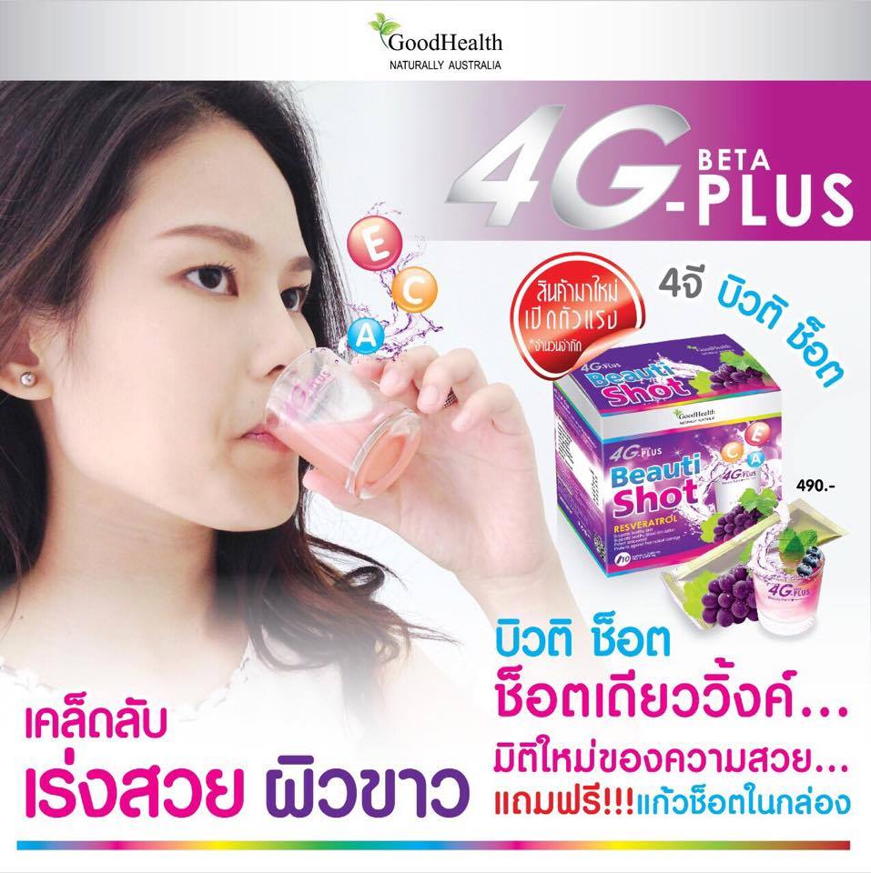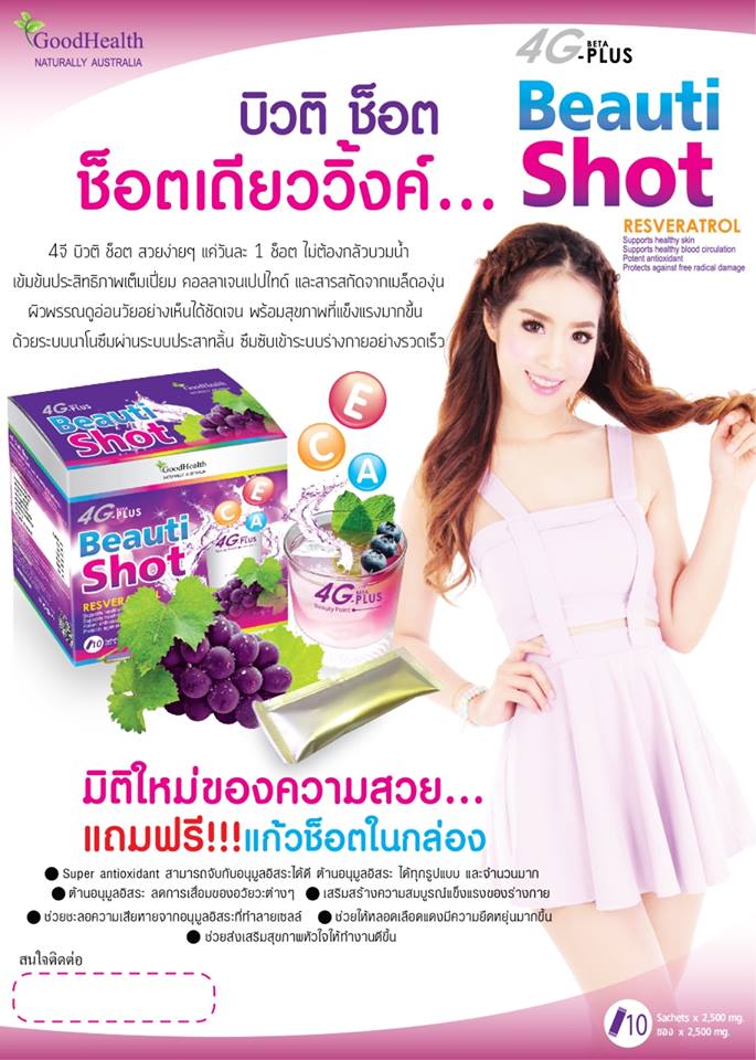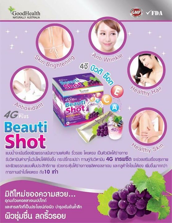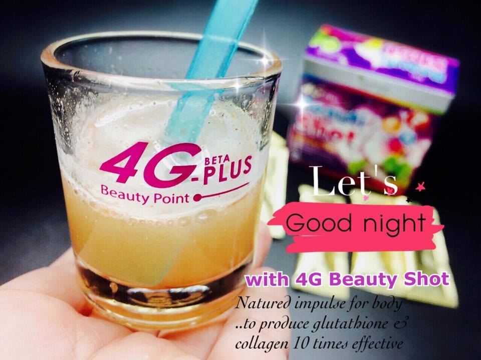 4G Beauti Shot เป็นอาหารเสริมคอลลาเจน เปปไทด์ร่วมด้วยสารสกัดจากเมล็ดองุ่น ออสเตเลีย คุณภาพสุง ผลิตด้วยระบบนาโนโมเลกุลเล็กจิ๋วดุดซึมได้ง่ายหมดจดร่างกายดูดซึมนำไปใช้ได้ทันทีผ่านระบบประสาทลิ้น มีผลช่วยฟื้นฟุประสิทธิภาพเซลล์ในส่วนต่างๆของร่างกาย วิตามินนี้สามารถผ่านได้สุ่ผิวหนังได้รวดเร็วมากขึ้นกว่าเดิม 100 เท่า4G Beauti shot ช่วย ฟื้นฟูสภาพผิวที่หมองคล้ำ ช่วยให้หน้าตาดูกระจ่างใส ผิวดุอ่อนกว่าวัย ริ้วรอยต่างดูจางลง ร่องต่างต่างแลดูตื้นขึ้น